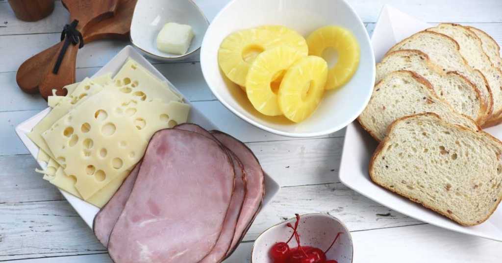 - Top each toast with two slices of ham, a pineapple ring and one slice of cheese.