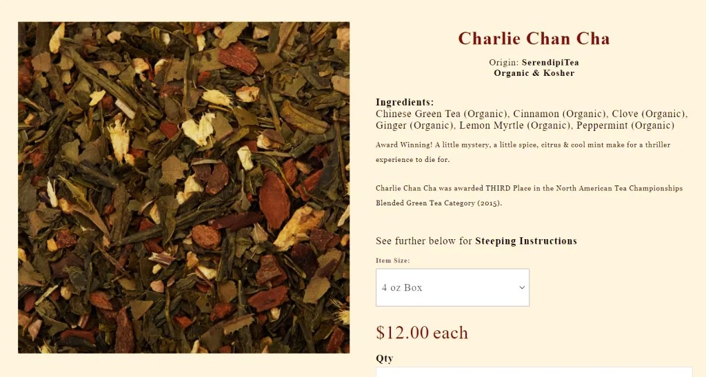 Charlie Chan Cha Tea. Det. Charlie Chan of literature was a “teetotaler” and he drank his tea like so, “Three lumps of sugar and the breath of the lemon in passing.” (Behind That Curtain, 1928.) So if the description for Charlie Chan Cha tea tickles your fancy this is your choice of beverage! (Award Winning! A little mystery, a little spice, citrus & cool mint make for a thriller experience to die for.)