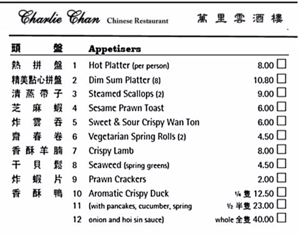 No better place to find one than The Charlie Chan Restaurant, Cambridge, United Kingdom. There are many restaurants with the family name Chan. However, those named Charlie Chan–not so many. This restaurant’s story is most interesting, and their employees have tenure of 20, 30 and 40-plus years!. They’ve been around (in one form or another) since 1966. Then, in 1982, London restaurateur, Peter Lee, took over the Pagoda restaurant and renamed it after his new Head Chef and founding partner, Charlie Chan. This may well be the oldest Chinese cuisine restaurant with the name Charlie Chan…anywhere! So pick an appetizer from their list and dig in at Charlie Chan.