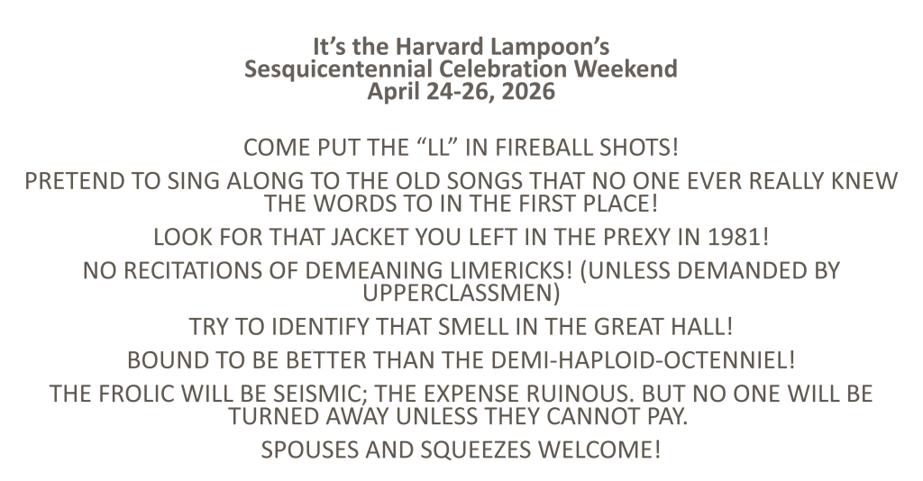 So dig into those bios my fellow plebeians, and enjoy with me by osmosis Harvard Lampoon’s Sesquicentennial Celebration Weekend!